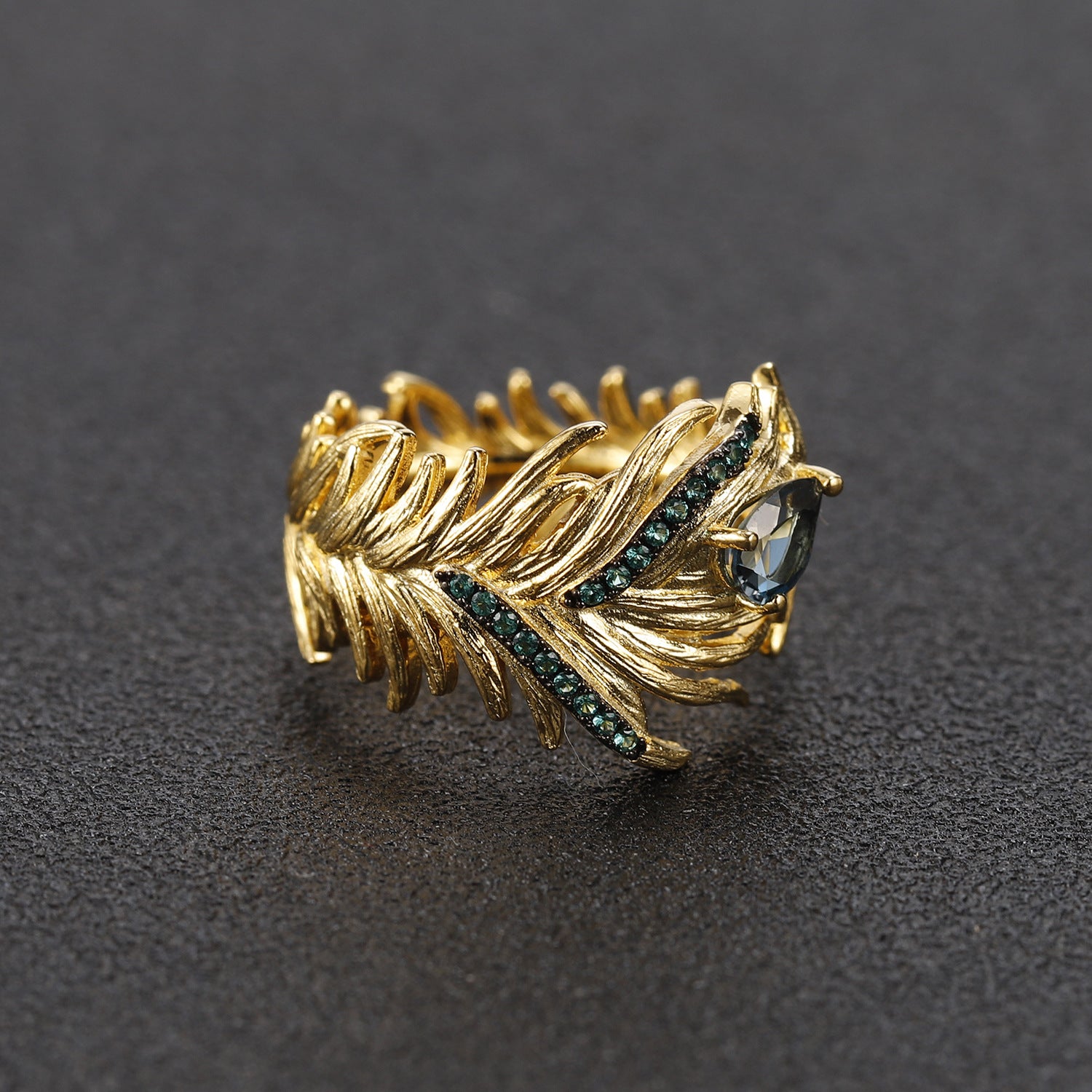 Designer Adjustable Open Ring with Bird Feather Design925Silver Natural Topaz Ring