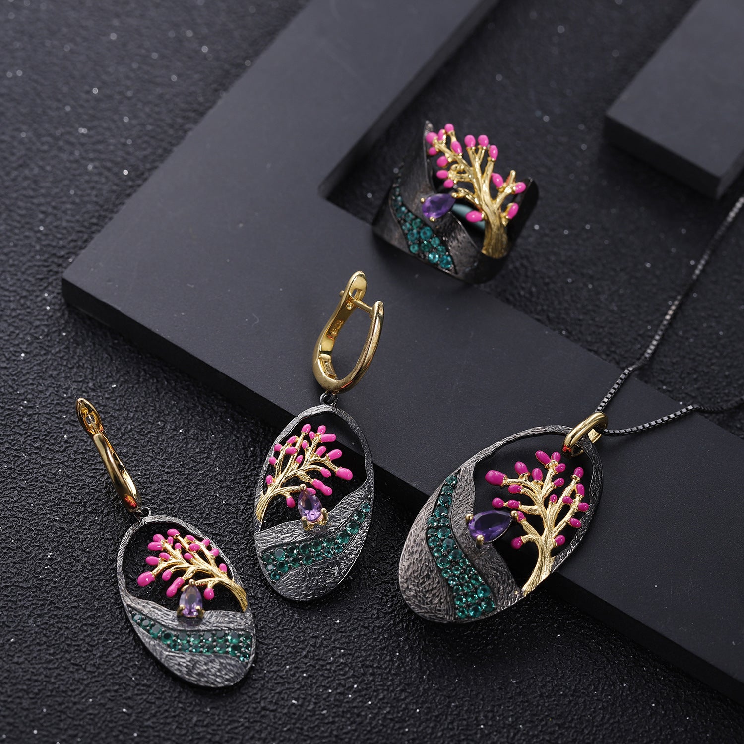 Designer Natural Style Tree of Life Ring Italian Craft Retro s925Silver Natural Amethyst Ring