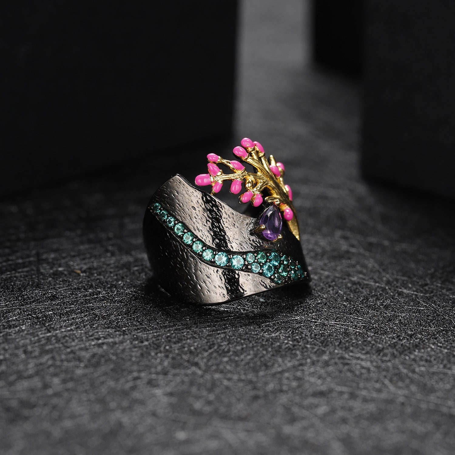 Designer Natural Style Tree of Life Ring Italian Craft Retro s925Silver Natural Amethyst Ring