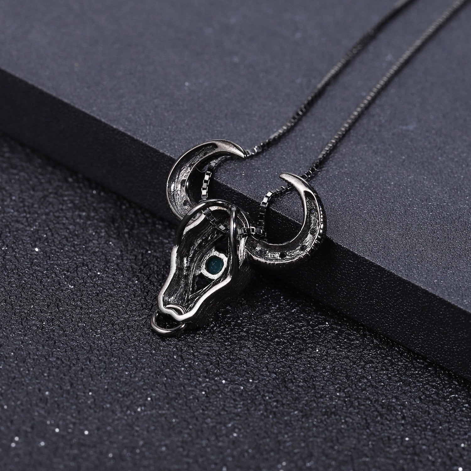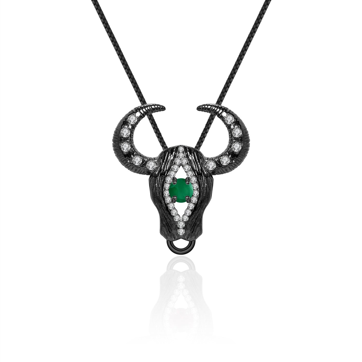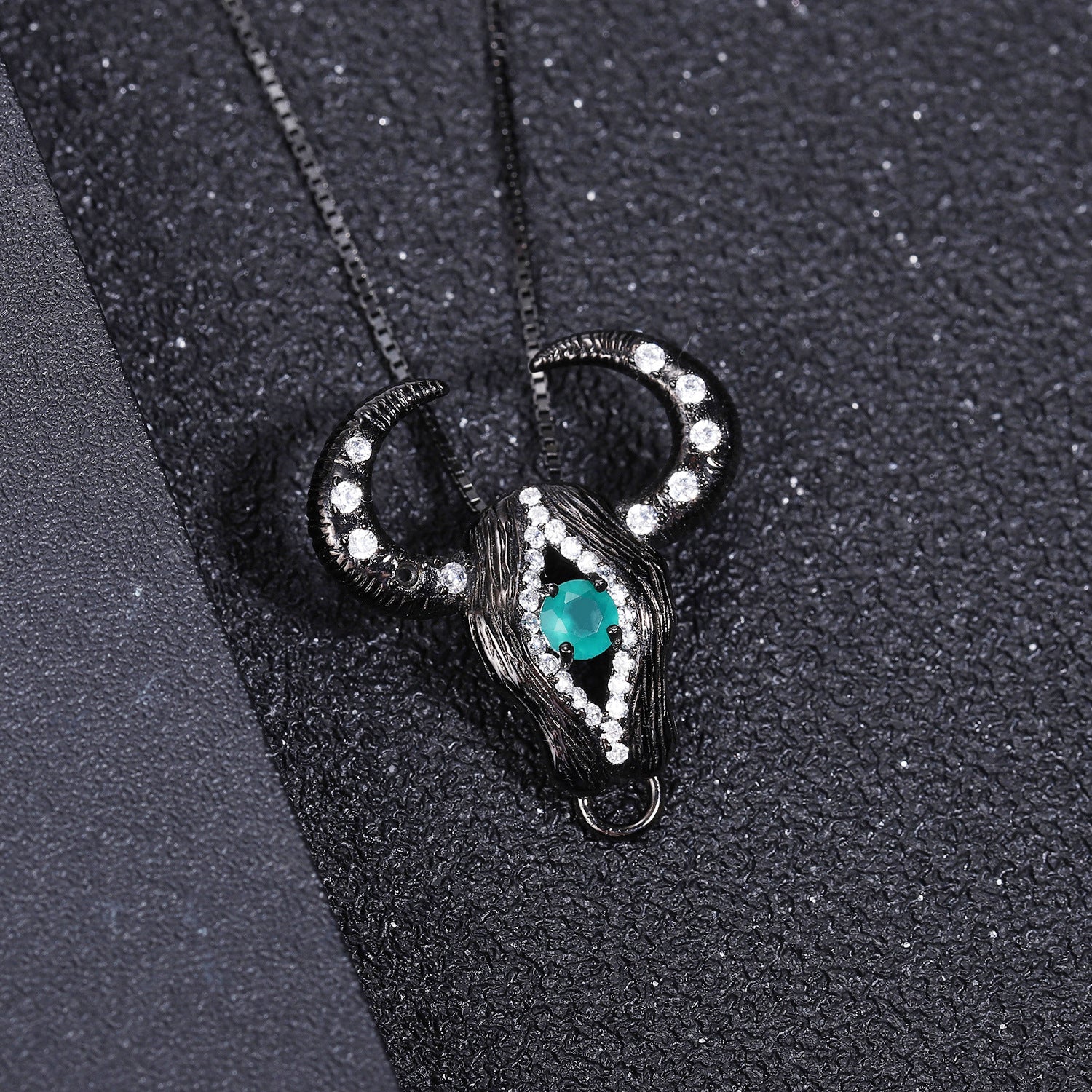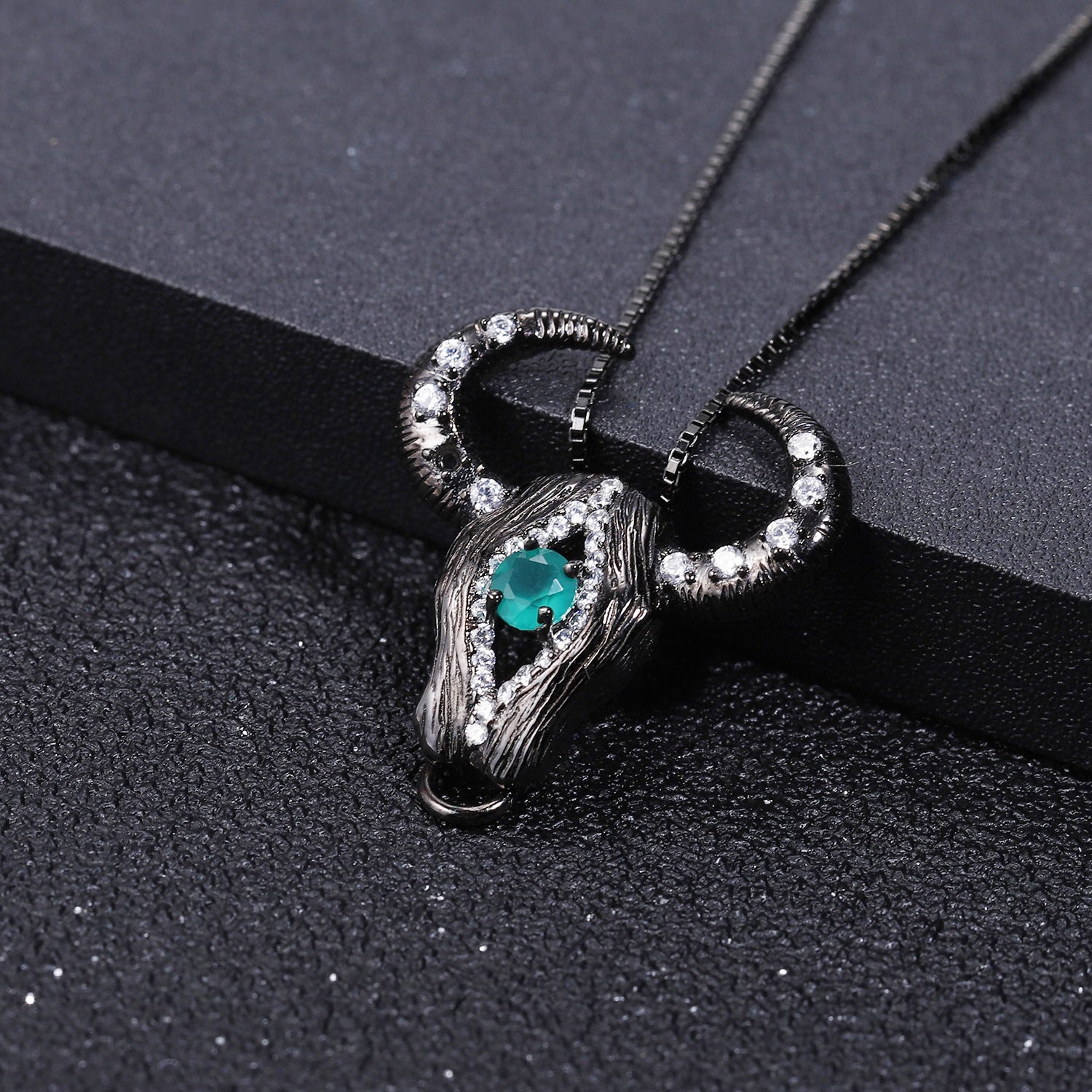 Designer Style Classic of Mountains and Seas Bull Head Pendant Dark Retro Design s925Silver Inlaid Green Agate Necklace Pendant