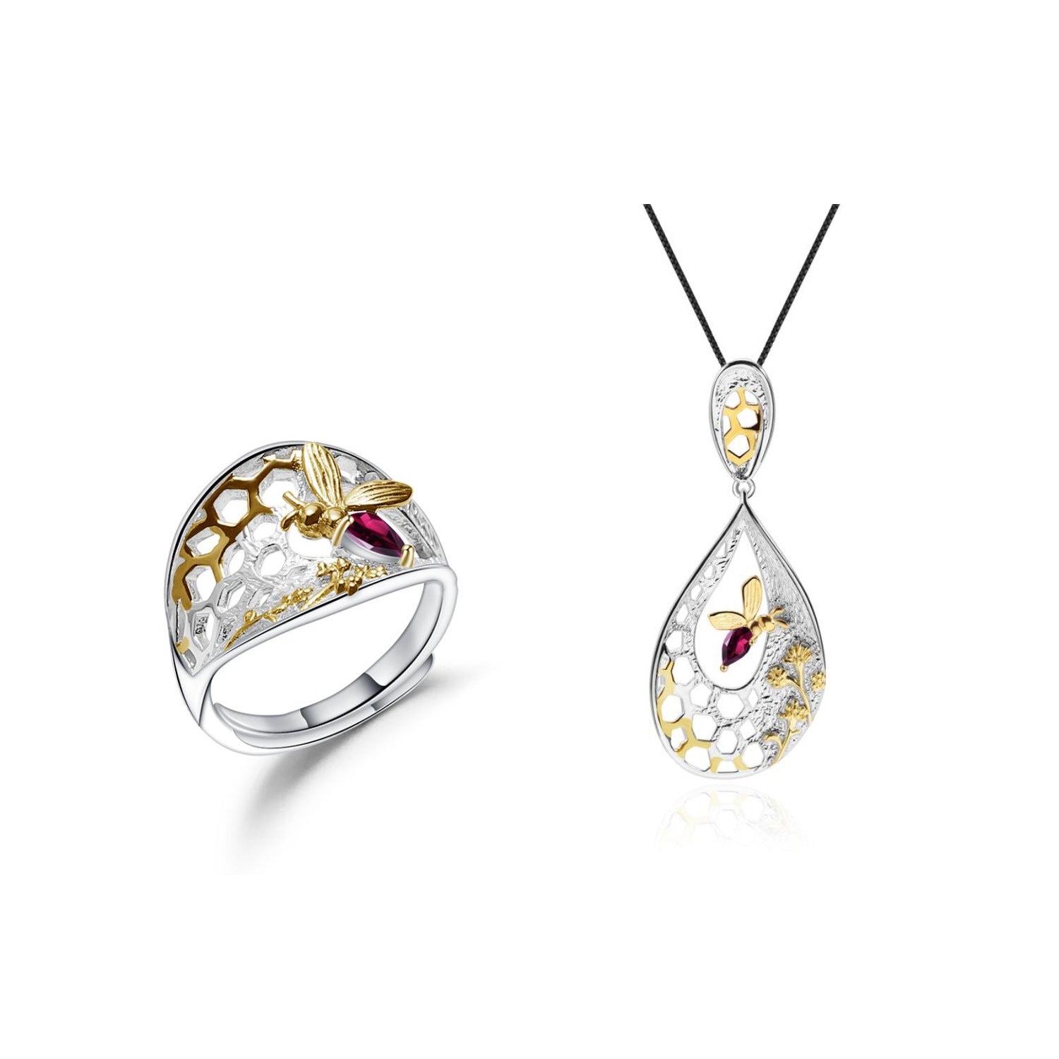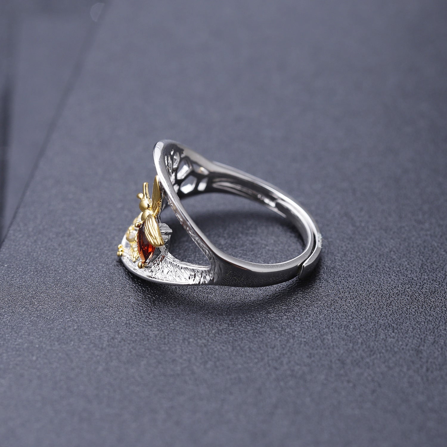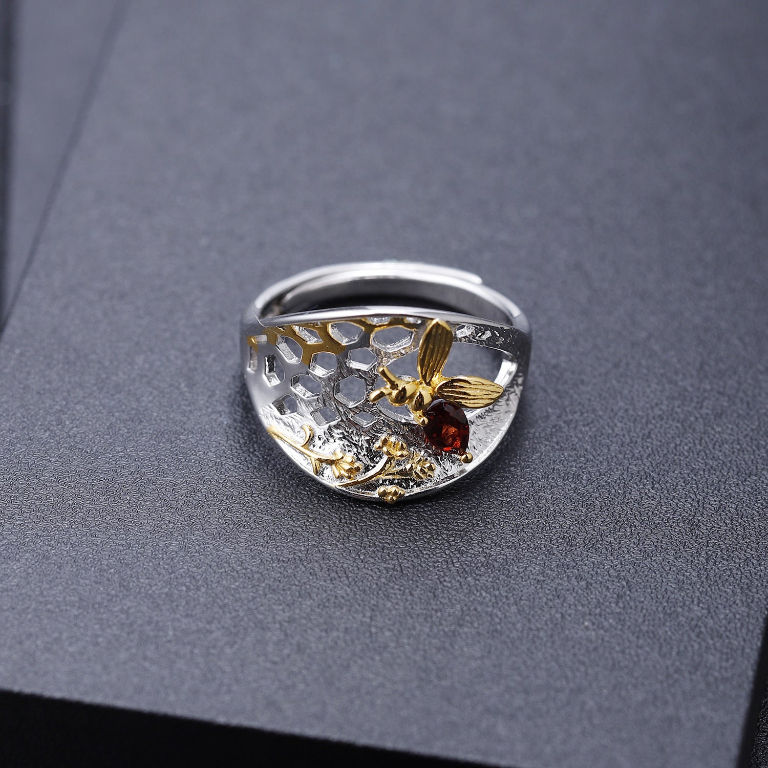 Designer Style Natural Wind Adjustable Open Ring Beehive Design s925Silver natural gemstone ring