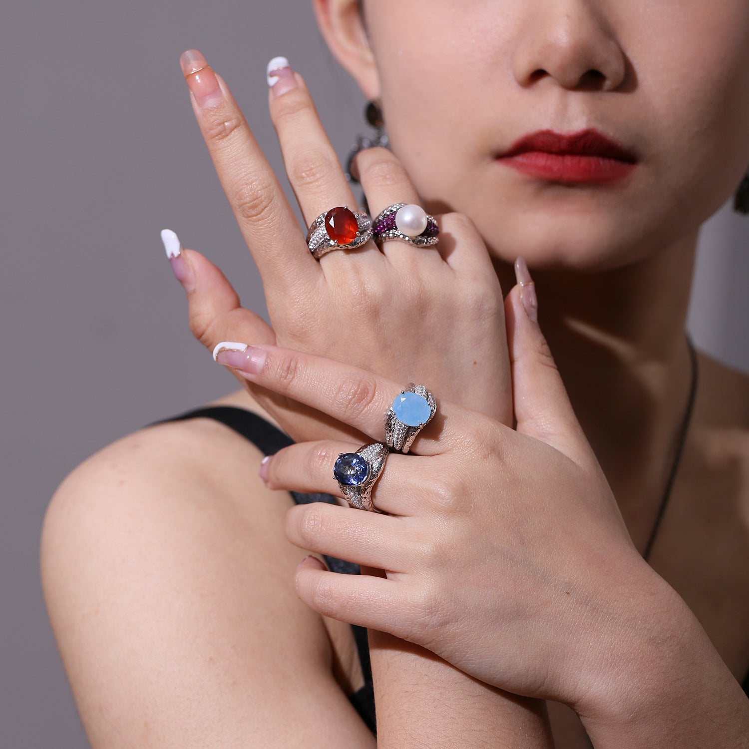 Freshwater Pearl Red Agate Sea Blue Chalcedony Crystal Ring s925Sterling Silver High-End Design Gemstone Ring for Men and Women