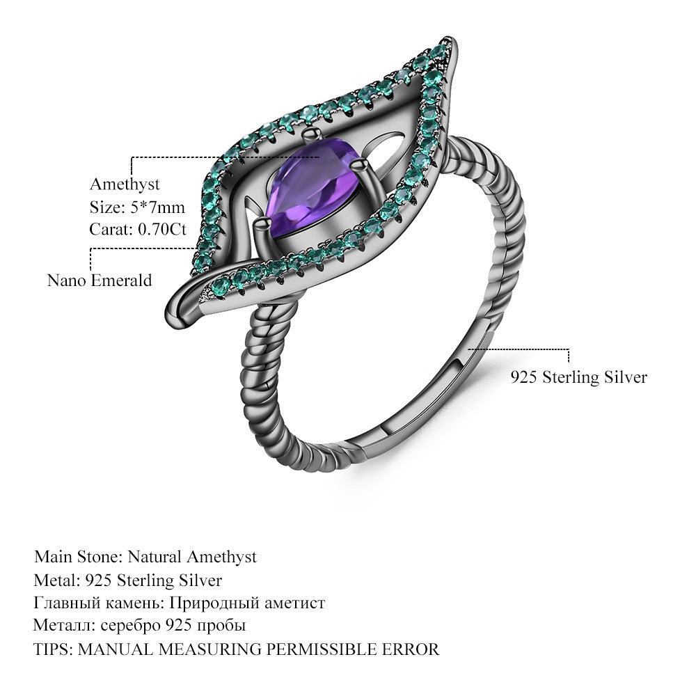 Italian Craft Designer Ring Natural Wind Leaf Design925Silver Inlaid Natural Amethyst Ring