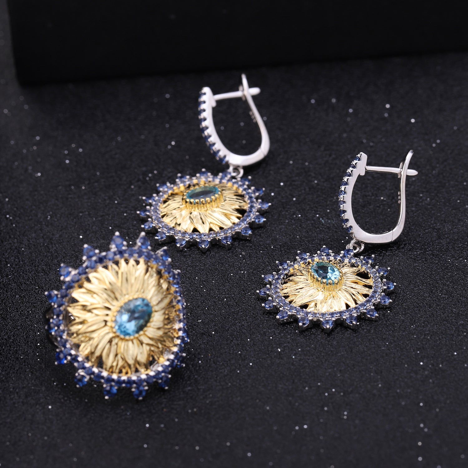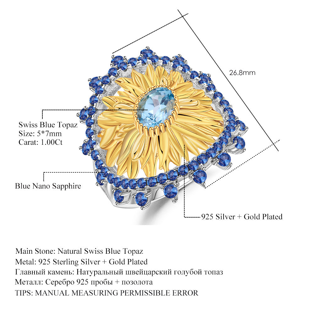 Original Designer Sunflower Ring Italian Craft Vintage Style925Sterling Silver Natural Topaz Ring